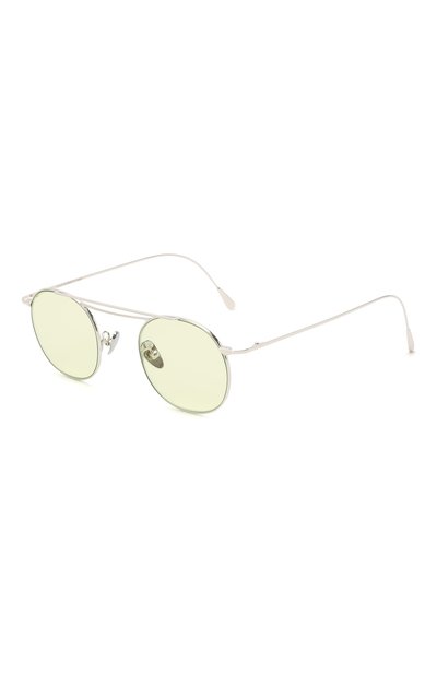 Солнцезащитные очки с тонкой округлой оправой выполнены вручную из облегченного металла с палладиевым покрытием. Светло-зеленые плоские линзы блокируют 100% вредного для глаз УФ-излучения. Аксессуар с регулируемыми носоупорами дополнен гибкими дужками.