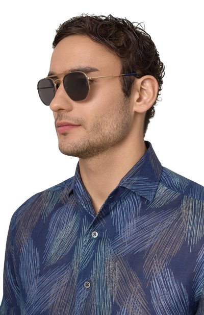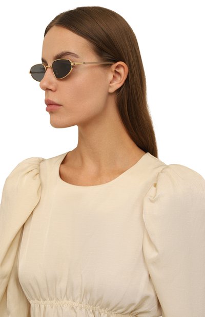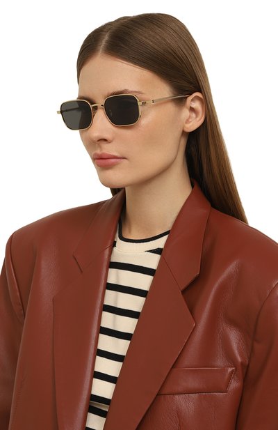 Мастера марки произвели круглые солнцезащитные очки из легкого металла с золотистым напылением. Темные зеркальные линзы полностью блокируют ультрафиолетовое и инфракрасное излучение. Аксессуар украшен миниатюрной белой надписью в виде логотипа бренда.