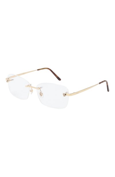 Безободковая оправа со знаковым для бренда мотивом Panthere de Cartier ставит знак равенства между красотой и комфортом. Мастера марки выполнили узкие фигурные дужки из легкого глянцевого металла с золотым напылением, а для изготовления заушников использовали гладкий черепаховый ацетат.