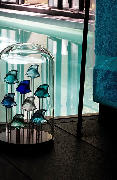 В 1913 году Рене Лалик впервые создал из стекла скульптуру в виде рыбы. Дизайнеры марки воспроизвели изделие, выбрав на этот раз для его изготовления сатинированный хрусталь. Например, эта небольшая фигура выполнена в дымчато-сером оттенке. Игра света, проходящего сквозь предмет и отраженного от вырезанной вручную чешуи и отполированных плавников, придает особую реалистичность и эффект движения.