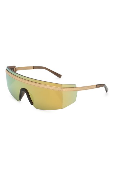 Солнцезащитные очки с шорами и желтой зеркальной монолинзой полностью блокируют УФ-лучи и не искажают восприятие цветов окружающего мира. Логотипы бренда выгравированы на узких дужках и оправе из легкого золотистого металла.