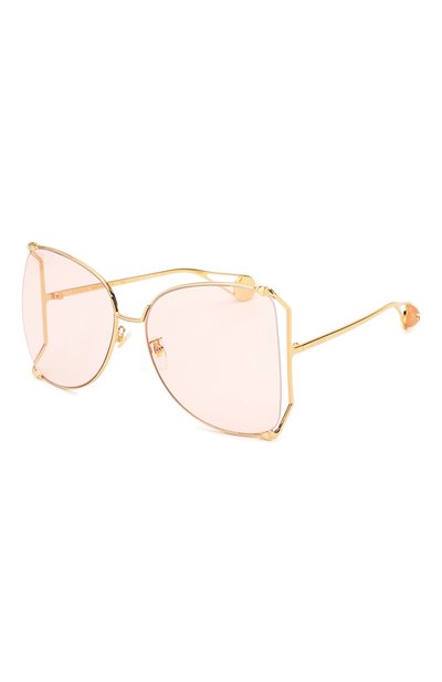 Крупные очки в золотистой тонкой оправе в форме крыла бабочки не выглядят массивно, а прозрачные линзы с неярким розовым покрытием на 100% защищают глаза от вредного воздействия UVA/UVB лучей. Раздвоенные концы тонких дужек крепятся к ободам деталями в виде миниатюрной головы змеи. Ажурные заушины декорированы жемчужными бусинами с GG-моногра ммой.