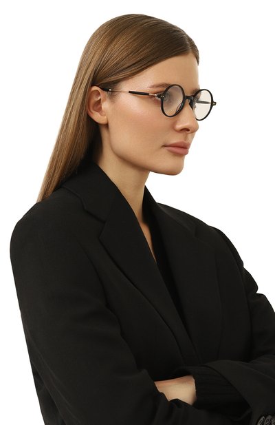 Тонкую оправу мастера марки выполнили вручную из легкой прочной стали с полуматовым покрытием оттенка розового золота. Круглую форму рамок подчеркнули черными вставками из полированного глянцевого ацетата. Узкие дужки с цельными миниатюрными заушниками обеспечивают комфортную посадку, почти не утяжеляя аксессуар.