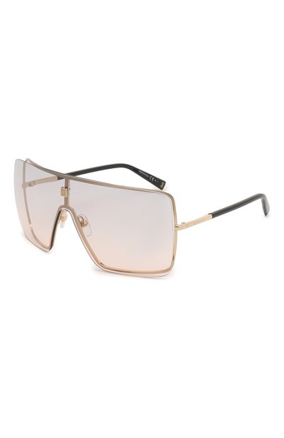 Эти солнцезащитные очки способны стать стилеобразующей деталью образа. Цельную линзу бледно-розового оттенка присоединили поверх золотистой металлической оправы, поэтому модель выглядит двуслойной. В качестве крепежа использовали элемент с выгравированной эмблемой бренда. При этом аксессуар хорошо защищает глаза от вредного воздействия лучей.