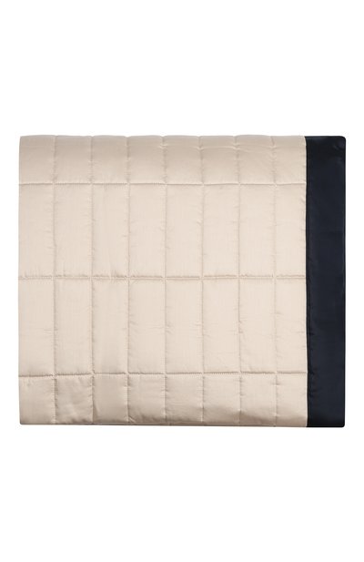 Покрывало нейтрального бежевого цвета гармонично впишется в любой интерьер. Для пошива аксессуара с темно-синей каймой мастера марки использовали шелковистый на ощупь хлопковый сатин. За счет геометрического стеганого узора равномерно распределенный легкий утеплитель не сваляется со временем или во время чисток.
