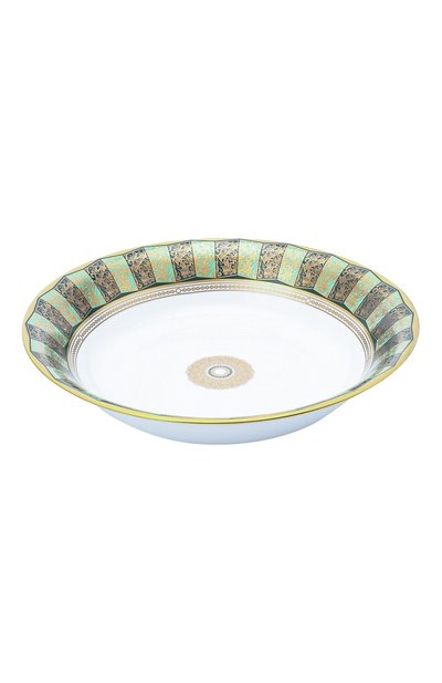 На посуде из коллекции Eventail Vert художники мануфактуры, основанного Леонардом Бернардо, сделали старинный веерный рисунок ярче. На этой обеденной тарелке из тонкого лиможского фарфора его нанесли поверх насыщенного фона изумрудного и травянисто-зеленого оттенков. На создание одного изделия требуется не менее недели работы: за это время посуда проходит этап двойного обжига, который обеспечивает мелодичный звон, и только после этого ремесленники полируют узор вручную, чтобы получить деликатный блеск .