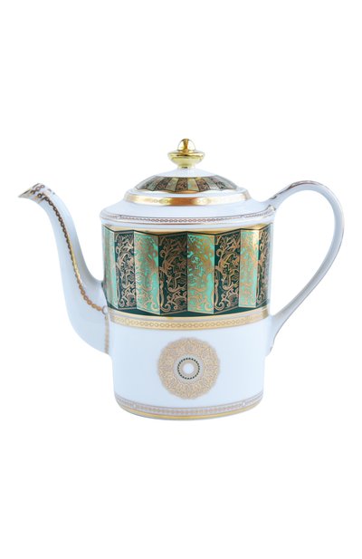 На этом кофейнике из тонкого лиможского фарфора старинный мотив, напоминающий золотистую вышивку, нанесли поверх яркого фона изумрудного и травянисто-зеленого оттенков. На создание каждого предмета из сервиза Eventail Vert требуется не менее 50 операций, которые выполняют исключительно вручную. Технология двойного обжига, один из которых длится не менее 24 часов, обеспечивает посуде мелодичный звон.