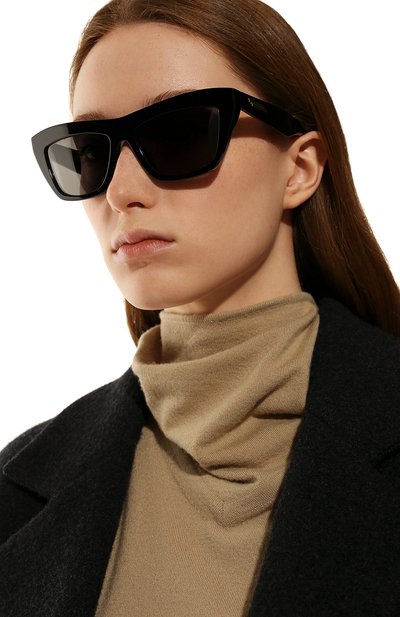 Крупные солнцезащитные очки помогут правильно расставить акценты в образе. Мастера марки использовали для создания квадратного аксессуара черный глянцевый ацетат. Модель с темными линзами, на 100% защищающими глаза от вредных инфракрасных и ультрафиолетовых лучей, украсили фигурной золотистой накладкой.