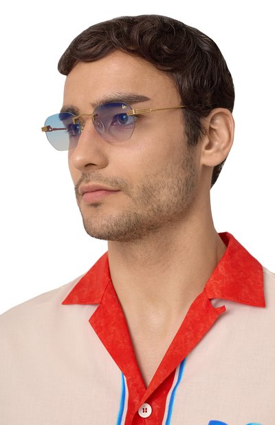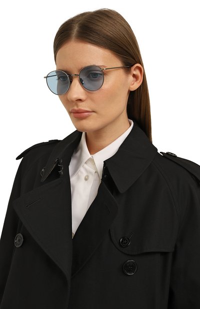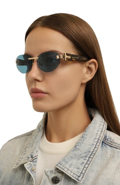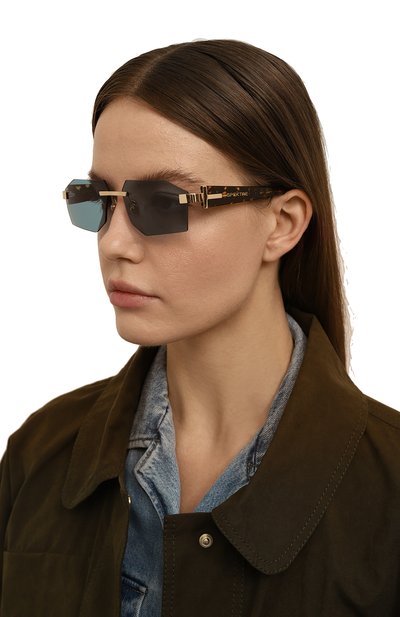 Солнцезащитные очки с прозрачными голубыми линзами блокируют ультрафиолетовые лучи наравне с классическими черными моделями. Шестиугольная тонкая оправа выполнена из легкого металла, узкие дужки — из коричневого пятнистого ацетата. Аксессуар дополнен съемной цепочкой.