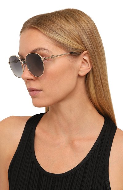 Овальные солнцезащитные очки с темно-синими градиентными линзами на 100% защищают глаза от вредных УФ-лучей. Для изготовления аксессуара с массивными дужками из черного глянцевого ацетата мастера марки использовали золотистый металл. Из такого же легкого материала выполнили съемную цепочку шатлен, входящую в комплект.