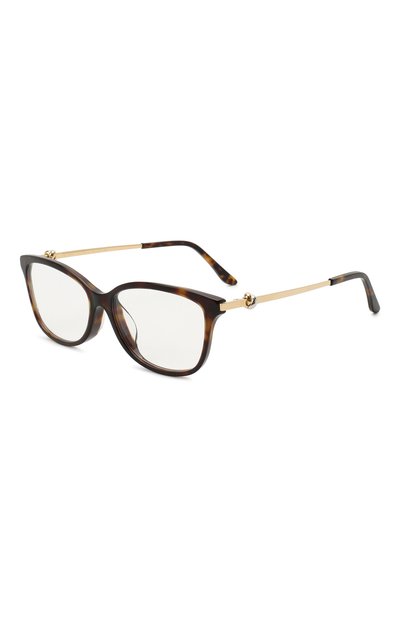 При создании коричневой оправы формы cat eye дизайнеры марки сыграли на контрасте оттенков и фактур. Рамку и заушники выполнили из прочного черепахового ацетата, узкие дужки с фигурным декоративным элементом ‒ из полированного позолоченного металла. Такой аксессуар впишется и в формальный образ, и в повседневный наряд.