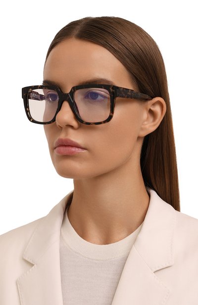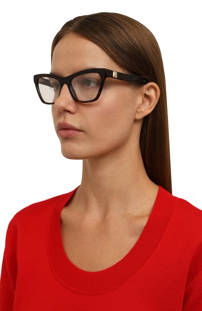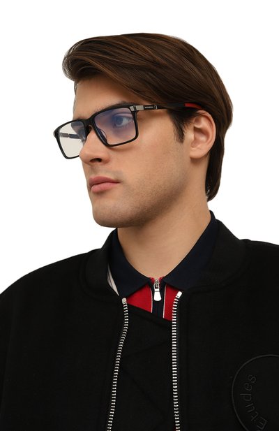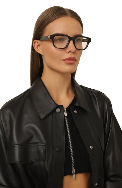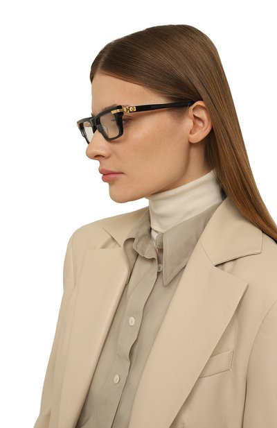 Черную матовую оправу выполнили из прочного ацетата, который не боится царапин и надолго сохраняет первоначальный внешний вид. Чтобы лаконичная модель не выглядела просто, ее дополнили деталями из золотистого титана: нарочито удлиненными креплениями и пластинами с литерой B.