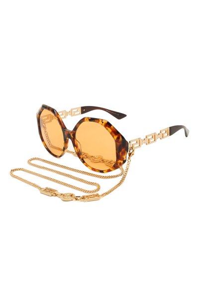 Коричневые солнцезащитные очки могут стать стилеобразующим элементом в образе. На это работает как крупная оправа из легкого ацетата с черепаховым мотивом, так и декор. Широкие дужки дополнили вставками с объемным меандровым узором. Орнамент поддерживает съемная цепочка, которую подчеркнули и деталью в виде головы горгоны Медузы.