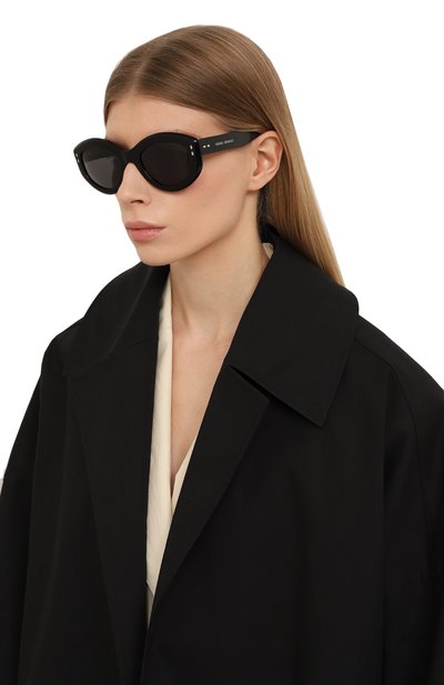 Крупные очки овальной формы могут стать стилеобразующей деталью в образе. Модель из прочного гладкого ацетата почти полностью очищена от декора (только логотип марки на дужке), поэтому будет уместна в любом наряде. За 100% защиты от ультрафиолета и ярких бликов отвечают затемненные нейлоновые линзы.