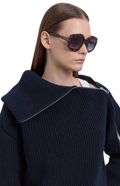 Лаконичный силуэт очков смягчает золотисто-коричневая гамма черепахового ацетата, из которого они выполнены. Легкий материал отличается особой прочностью, поэтому аксессуар прослужит долго. Дымчатые линзы в тон защищают глаза от ультрафиолета и ярких бликов, сохраняя контрастность изображения.