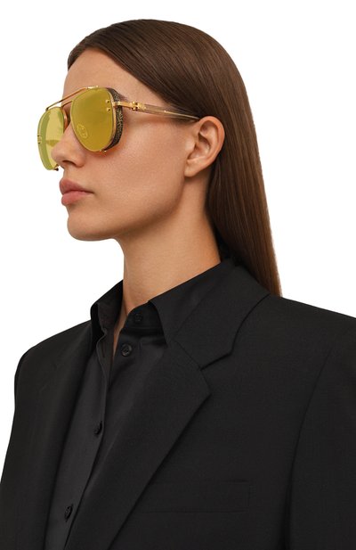 Солнцезащитные очки, представленные эксклюзивно в ЦУМе, станут удачной находкой для любителей нестандартных решений. Обратить на себя внимание аксессуару из прочного металла помогают крупные квадратные линзы желтого цвета. Модель выглядит графично из-за узких полос спереди и на дужках.
