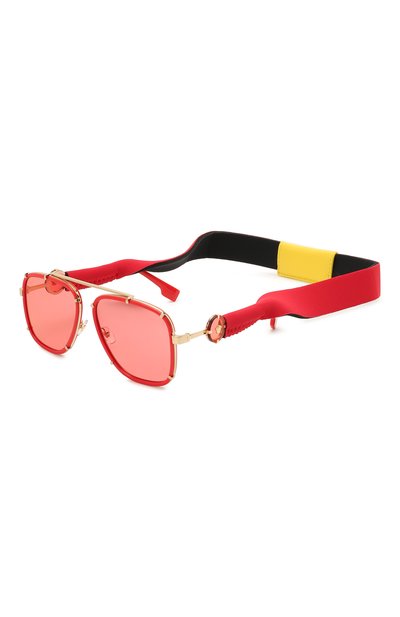 Крупные очки выведут на новый уровень даже самый простой образ. С красными линзами, обеспечивающими 100% защиту от вредного ультрафиолетового излучения, перекликаются круглые вставки на узких дужках, украшенные знаковой для бренда Медузой Ронданини. Аксессуар выполнили из легкого, но при этом прочного металла.