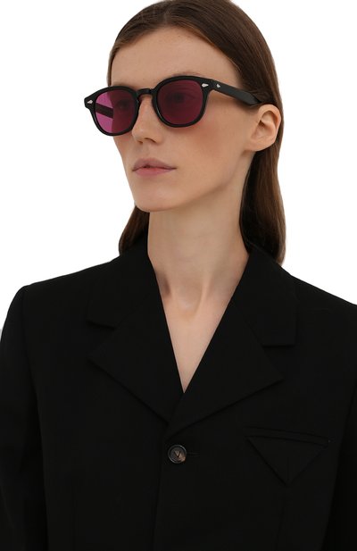 Очки с линзами из поликарбоната оттенка фуксии защищают от солнца не хуже классических темных моделей и блокируют 100% ультрафиолетовых лучей, не искажая изображение. Для изготовления круглой черной оправы использовали легкий и при этом прочный ацетат.