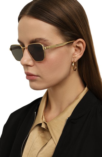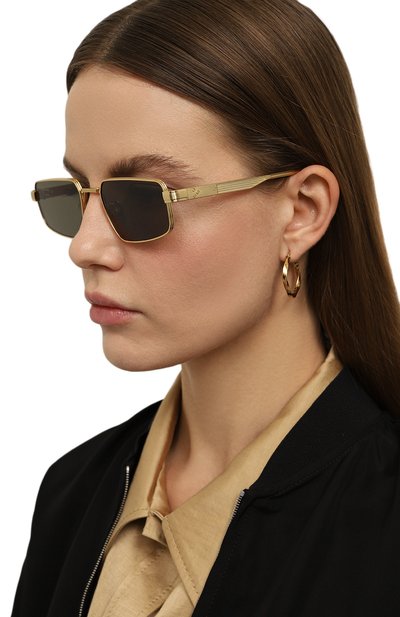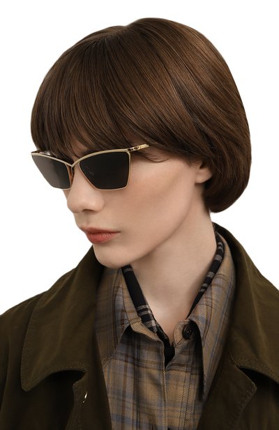 Узкая золотистая оправа этих солнцезащитных очков смотрится особенно эффектно в тандеме с темно-серыми линзами. Для изготовления аксессуара с двойным мостом использовали легкий сплав. Роль декора отдали фигурным креплениям тонких дужек.