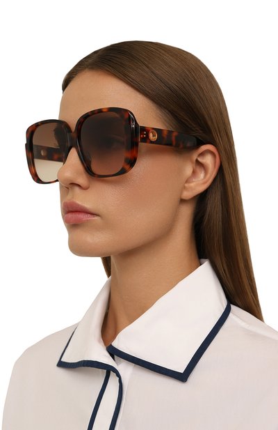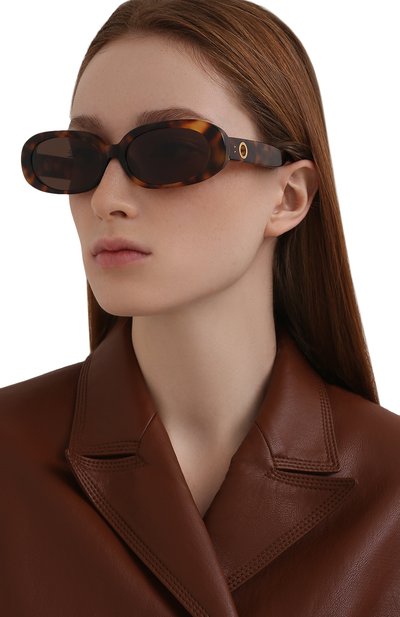 Черепаховую оправу солнцезащитных очков мастера марки вручную выполнили из легкого прочного ацетата, тщательно отполированного до зеркальной гладкости. Широкие дужки декорировали крупными люверсами из позолоченного титана. Однотонные темно-зеленые линзы из устойчивого к царапинам поликарбоната обеспечивают 100% защиты от ультрафиолетовых лучей и бликов, не искажая оттенки.