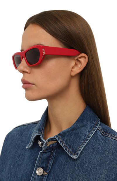 Малиновые очки формы cat eye, выполненные из матового гладкого ацетата, могут стать цветовым акцентом в образе. На принадлежность бренду указывают рельефные ВВ-монограммы на фигурных дужках. Затемненные нейлоновые линзы надежно защищают глаза от ультрафиолетовых лучей и ярких бликов.
