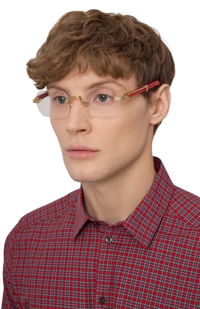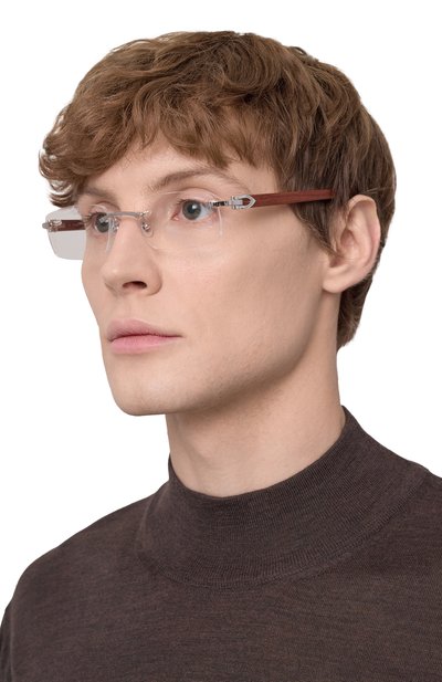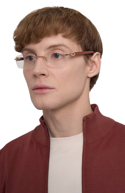 Для создания безободковой оправы использовали металл с гальваническим покрытием золотом. Дужки изделия выполнили из полированного дерева, а заушники украсили брендированными вставками.