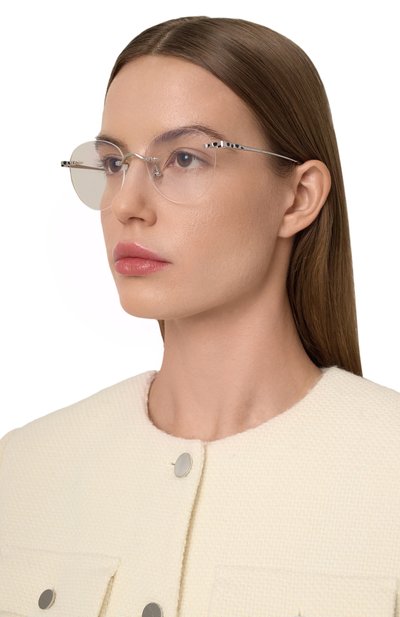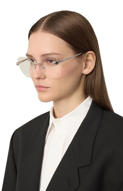 Узкая полуободковая оправа почти не ощущается на лице и не закрывает обзор. Для изготовления модели мастера марки использовали легкий, но прочный металлический сплав, деликатному блеску которого подыгрывают черные глянцевые накладки на заушниках. Крепления украсили знаковыми элементами в виде головы пантеры.
