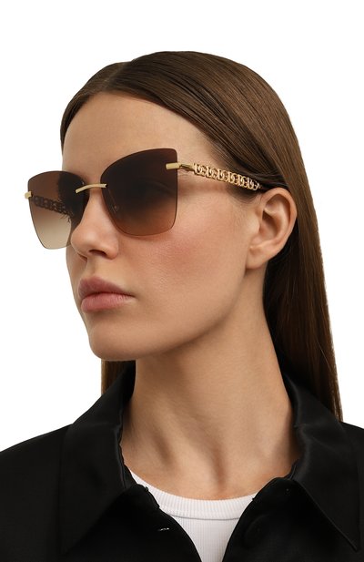 Одну из градиентных линз солнцезащитных очков декорировали культовой монограммой Кассандра. Аксессуар с полуободковой металлической оправой дополнили заушниками из полимера с черепаховым рисунком.
