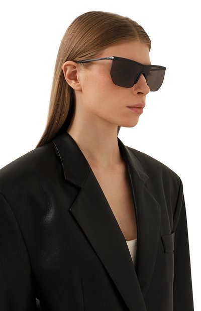 При создании черных солнцезащитных очков дизайнеры марки слов но обратились к силуэту горнолыжных масок, позаимствовав у них крупную монолинзу. С визуально массивной деталью контрастирует тонкая оправа. Ее изготовили из легкого, но прочного сплава с матовым покрытием.
