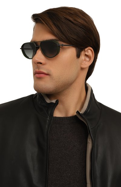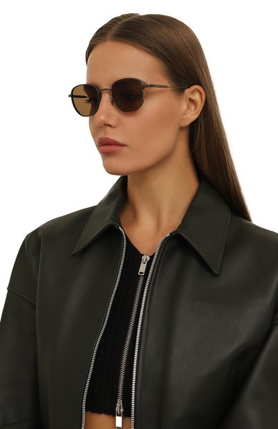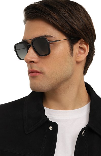 Для изготовления черной оправы с двойным мостом использовали легкий прочный титан. Из этого же материала выполнили фигурные серебристые вставки, подчеркивающие форму рамки. Зеркальные светлые линзы из тонкого поликарбоната защищают от солнечных лучей так же хорошо, как привычные затемненные.