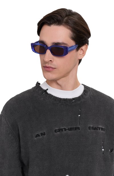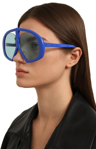 Солнцезащитные очки с широкой синей оправой выполнили из прочного гладкого ацетата. Такой материал считается одним из легких, поэтому визуально массивный аксессуа р почти не ощущается на лице. Изделие дополнили однотонными линзами, защищающими глаза от ультрафиолета.