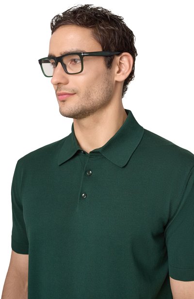 Прямоугольную оправу с седловидным мостом и фиксированными носоупорами изготовили из легкого ацетата. Лаконичный аксессуар дополнили узкими дужками.