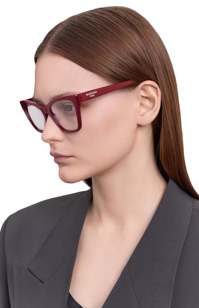 Оправа формы cat eye выглядит почти невесомой. Тонкие линии и пудровый оттенок только выиграли от материала: аксессуар выполнили из легкого гладкого ацетата, который практически не ощущается на коже. Роль декора отвели выгравированному логотипу на узких дужках из сплава и миниатюрным деталям в виде сердец.
