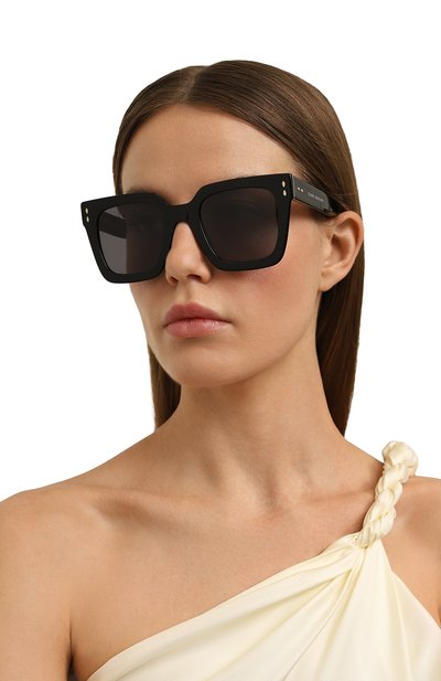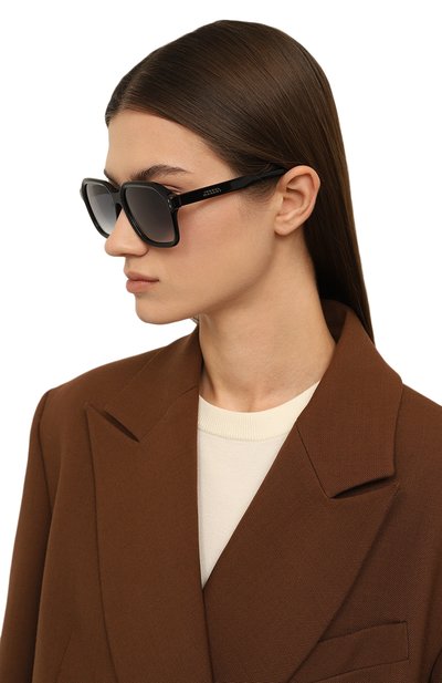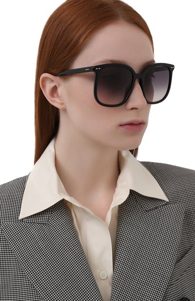 Черные очки выполнили из ударопрочного глянцевого ацетата, устойчивого к царапинам. Аксессуар дополнили градиентными дымчатыми линзами, которые на 100% блокируют вредные солнечные лучи, не снижая качества изображения. На широких дужках деликатно мерцает логотип марки и деталь в форме головы фирменного медведя.