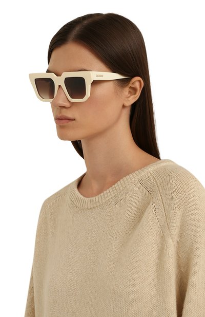 Широкая оправа зеленых солнцезащитных очков выглядит так, словно ее изготовили из мрамора. Нужного эффекта дизайнеры марки добились узором на легком прочном ацетате, из которого изготовили аксессуар. Дужки украсили миниатюрным золотистым логотипом бренда. Градиентные линзы защищают глаза от вредного воздействия УФ-лучей.