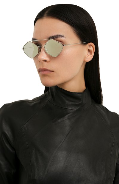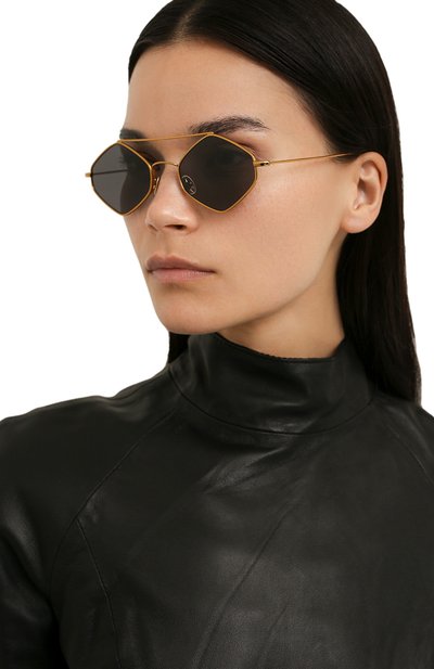 При создании золотистых солнцезащитных очков дизайнеры марки сделали ставку на геометрическую форму оправы. Эффект от силуэта в виде ромбов усилили затемненными линзами, контрастирующими с визуально невесомыми линиями рамки, дужек и двойного моста. Аксессуар выполнили из легкого сплава.