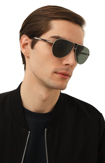 Для изготовления солнцезащитных очков из линии Santos de Cartier использовали металл. Двойной мост и дужки украсили фирменными вставками-винтами, а заушники подчеркнули отделкой с черепаховым узором.
