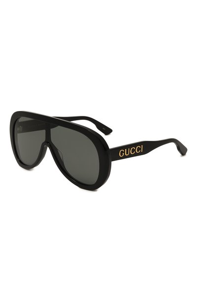 Черные солнцезащитные очки одинаково хорошо подойдут и мужчине, и женщине. Аксессуар, выполненный из отполированного до блеска прочного ацетата, украсили золотистой накладкой в виде логотипа марки на дужках. Модель дополнили монолинзой в тон, которая на 100% блокирует УФ-лучи и гасит блики, гарантируя комфорт и в городе, и на пляже.