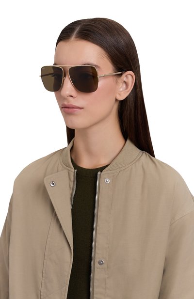 Солнцезащитные очки формы cat eye автоматически делают взгляд выразительным. Для изготовления аксессуара с узкими ободами, не загораживающими обзор, использовали отполированный металл цвета золота, для заушников — черепаховый ацетат, быстро перенимающий тепло кожи. Модель с подвижными носоупорами дополнили коричневыми линзами, на 100% блокирующими вредные УФ-лучи.