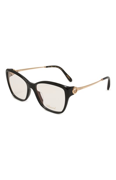 Для изготовления черной оправы формы cat eye мастера марки использовали легкий ацетат, отполированный до идеальной гладкости. С его глянцевым блеском перекликается мерцание прозрачных кристаллов, вставленных в круглые отверстия на золотистых дужках из ювелирного сплава. Этот декор отсылает к культовой модели часов Happy Sport.