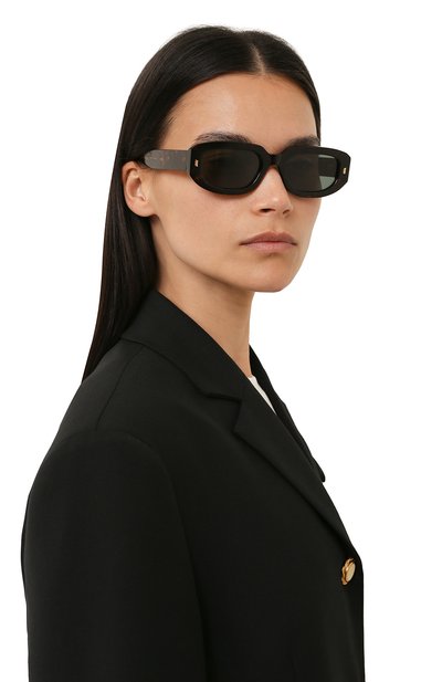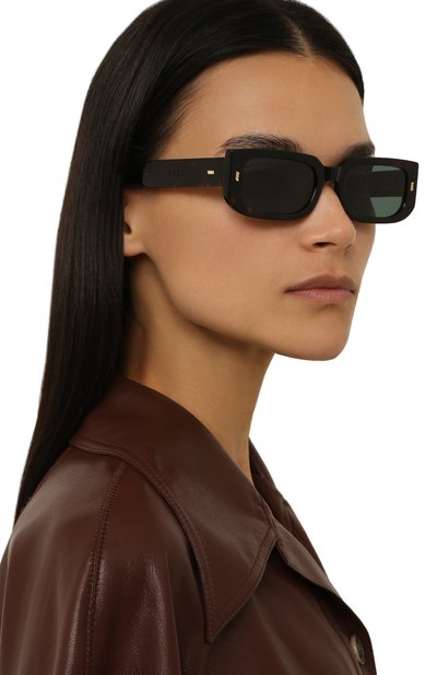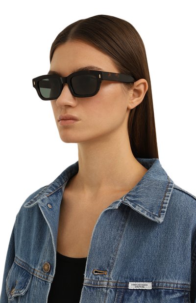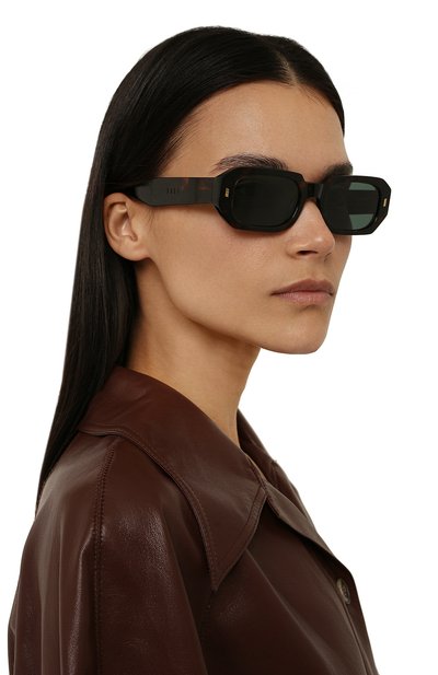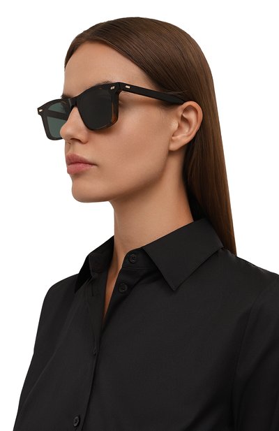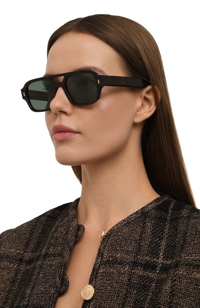 Мастера марки вручную выполнили темно-коричневую черепаховую оправу из легкого, но прочного ацетата, отполированного до идеальной гладкости. Серо-зеленые нейлоновые линзы с антибликовым покрытием обеспечивают 100% защиты от УФ-лучей и отраженного света. Модель, которая подходит и мужчинам, и женщинам, декорировали у основания дужек золотистыми рифлеными вставками.
