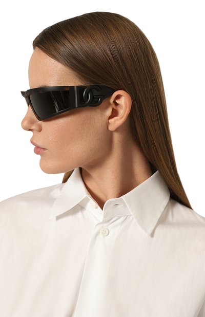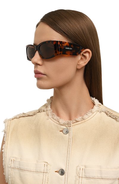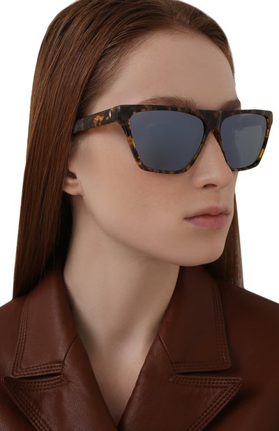Солнцезащитные очки с черепаховой оправой из легкого глянцевого ацетата сделают образ более ярким и выразительным. Аксессуар с широкими дужками, украшенными эмблемой марки, дополнили однотонными полупрозрачными линзами, блокирующими вредный для глаз ультрафиолет и не искажающими цветовосприятие.