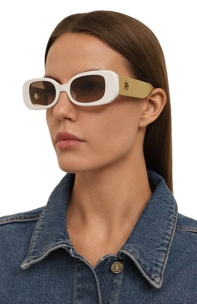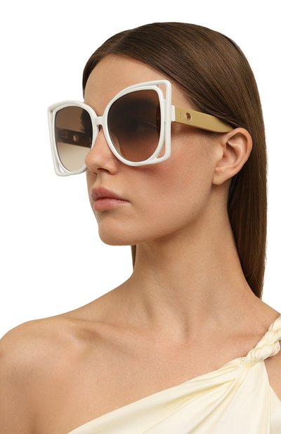 Для создания белых солнцезащитных очков формы cat eye мастера марки использовали прочный ацетат, отполированный до глянцевого блеска. Фигурные широкие дужки на несколько тонов темнее украсили крупными брендированными люверсами, покрытыми 22-каратным золотом. Градиентные линзы оттенка мокко на 100% блокируют УФ-лучи и не искажают цветопередачу.