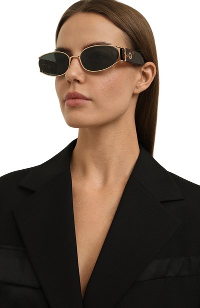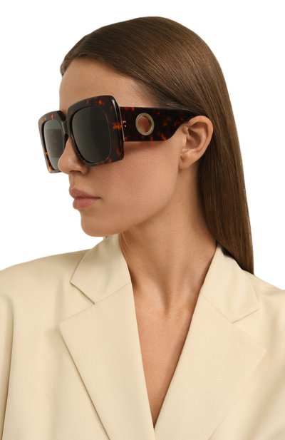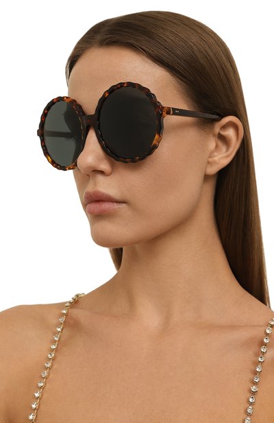 Темно-коричневые солнцезащитные очки изготовили из полупрозрачного черепахового ацетата. Рамку и широкие дужки, тщательно отполированные до глянцевого блеска, соединили с помощью заклепочных петель, окрашенных в тон. Темно-зеленые линзы на 100% блокируют ультрафиолет и поглощают блики, поэтому в аксессуаре будет комфортно и в городе, и на побережье.