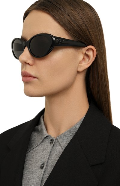 Широкую прямоугольную оправу черных солнцезащитных очков мастера марки выполнили из легкого глянцевого ацетата. Аксессуар с однотонными линзами на 100% блокирует вредное для глаз воздействие ультрафиолетовых лучей. Заушники декорировали вставками в виде миниатюрных люверсов.