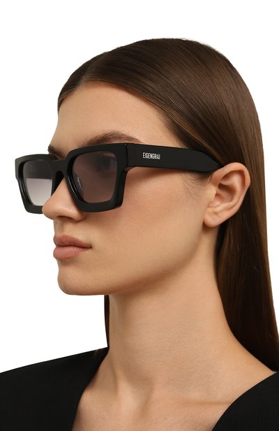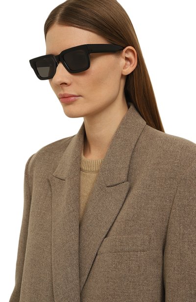 Для изготовления черных солнцезащитных очков дизайнеры марки выбрали глянцевый ацетат Mazzucchelli. Он не утяжеляет аксессуар и быстро перенимает тепло кожи, поэтому модель обеспечит комфорт при долгом использовании. Линзы, выполненные из ударопрочного нейлона, на 100% блокируют вредные UVA- и UVB-лучи. Роль декора отдали логотипу и эмблеме на широких фигурных дужках.
