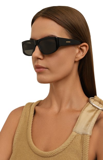 Черную оправу больших очков мастера марки выполнили из легкого прочного ацетата, отполированного до глянцевого блеска. Широкие дужки и внешние края рамок декорировали миниатюрными блестящими заклепками. Однотонные антрацитово-серые линзы обеспечивают 100% защиты от ультрафиолетовых лучей и в городе, и на залитом солнцем пляже.