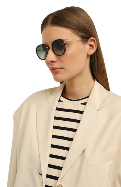 Солнцезащитные очки с круглой рамкой и тонкими дужками мастера марки выполнили из полированного металлического сплава. Для отделки использовали коричневый ацетат с черепаховым узором. Модель с голубыми градиентными линзами на 100% блокируют вредное воздействие ультрафиолетовых лучей.