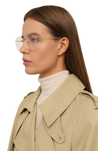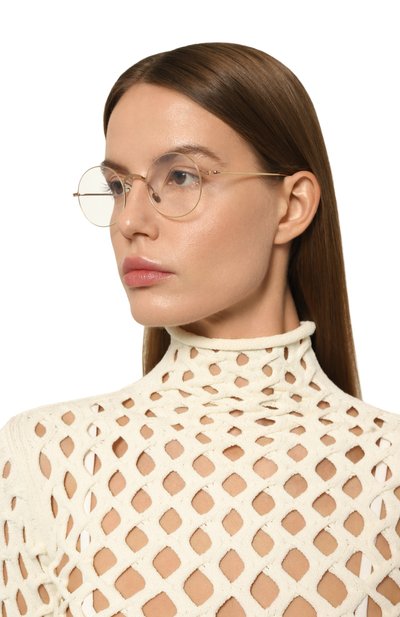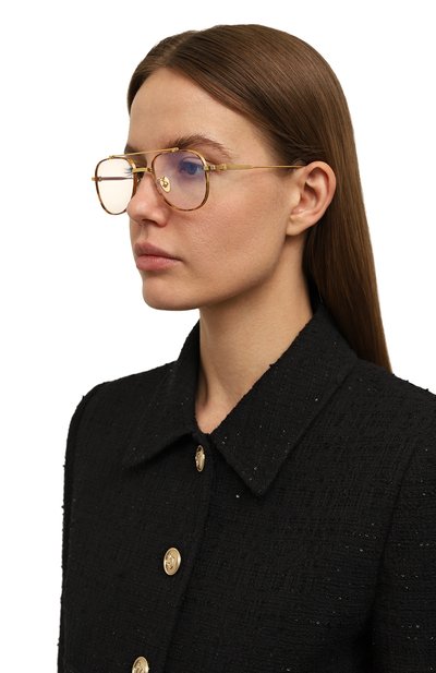 Мастера марки вручную изготовили тонкую оправу из легкого ультрапрочного титана, который не деформируется со временем. Покрытие оттенка античного золота и замысловатый выгравированный узор придают модели сходство с винтажными аксессуарами. Круглую форму рамок подчеркнули узким глянцевым кантом темно-синего цвета.