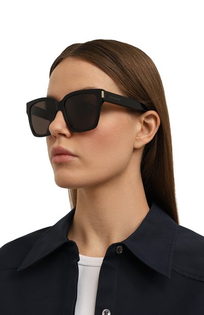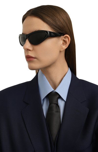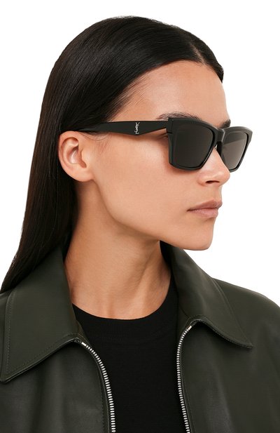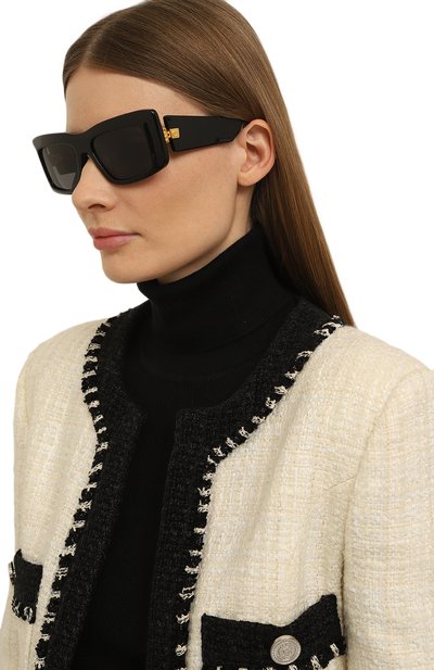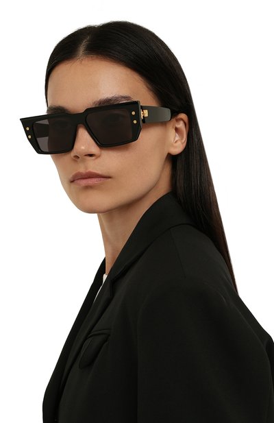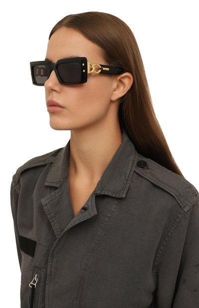 Черные солнцезащитные очки формы cat eye выполнили из ацетата, который считается настолько легким, что почти не ощущается во время долгого использования. На дужках разместили золотистые крепления с выгравированным логотипом бренда. Дымчатые линзы из прочного поликарбоната защищают от вредного ультрафиолета, не искажая изображение.